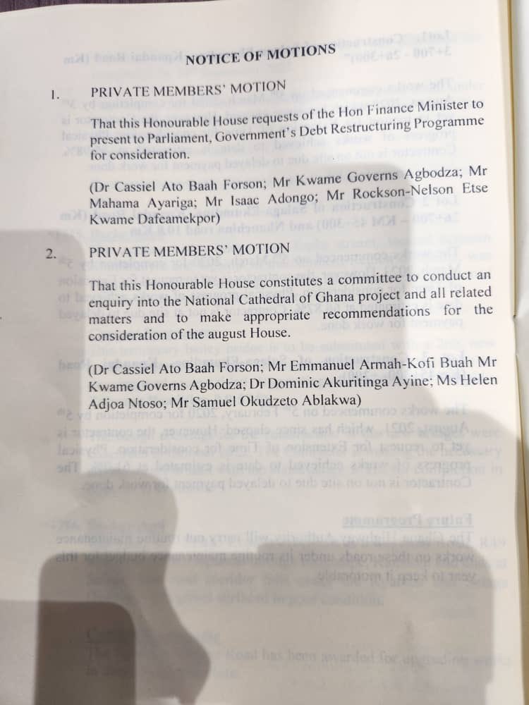 The Speaker of Parliament has admitted a private members’ motion from the Minority caucus to allow the setting up of a committee to probe the National Cathedral and all related matters.