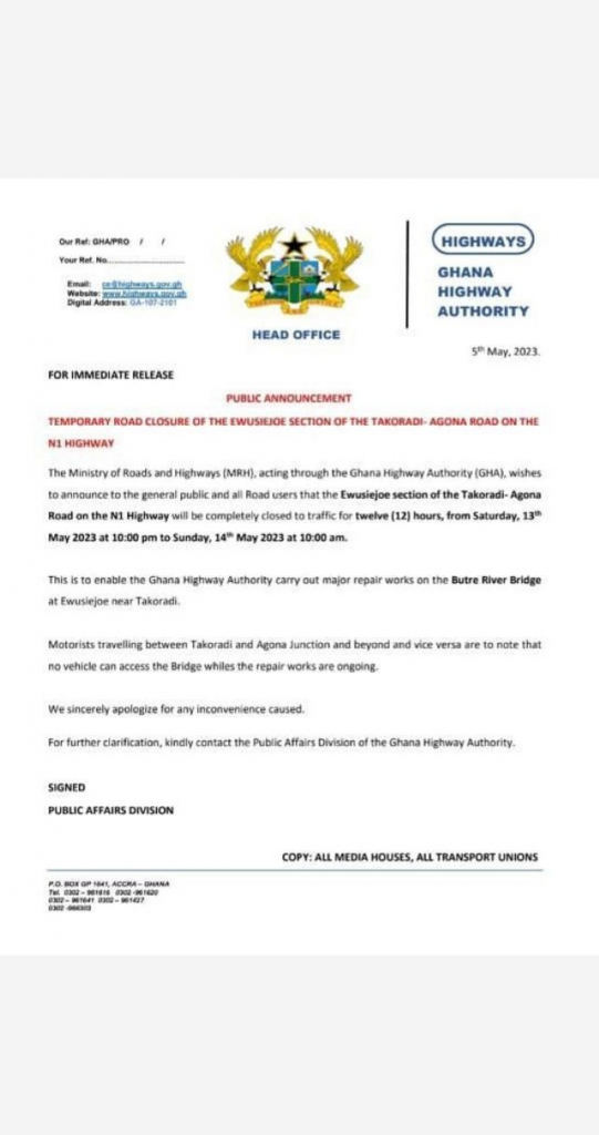 The Ghana Highway Authority has announced a temporary closure of the Ewusiejoe section of the Takoradi-Agona Road on the N1 Highway.