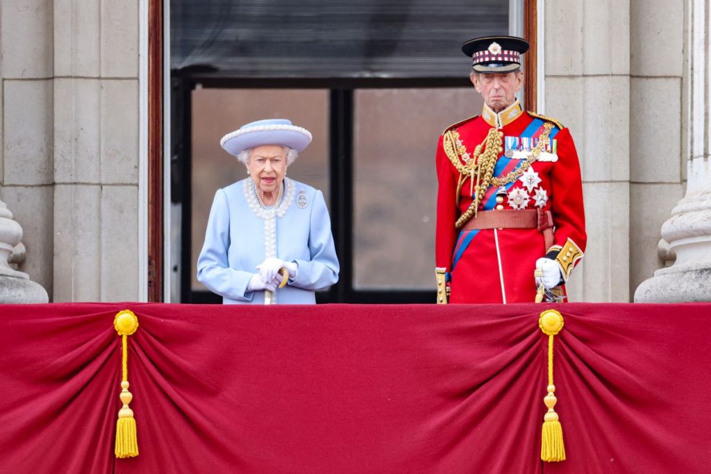 Elizabeth, holding a walking stick and wearing a dusky dove blue outfit that she also wore for an official Jubilee photograph released on Thursday, was joined by her son and heir Prince Charles, 73, and other senior royals on the balcony of Buckingham Palace.