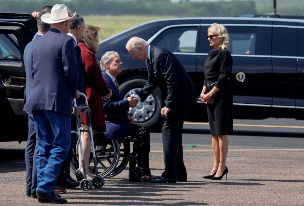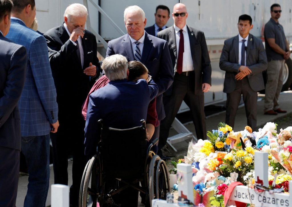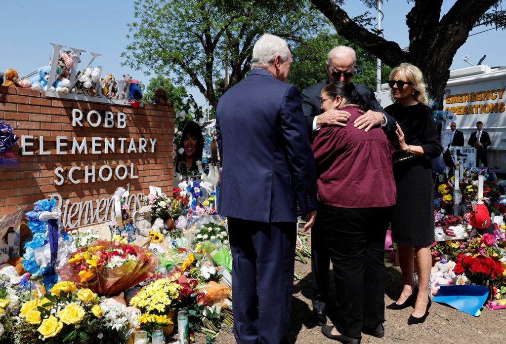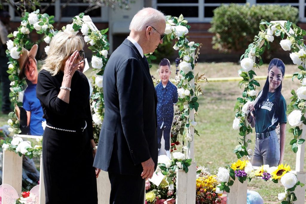 The president and first lady Jill Biden wiped away tears as they visited memorials at the Robb Elementary School where the gunman killed 19 students and two teachers, laying white roses and paying respects to makeshift shrines to the victims.