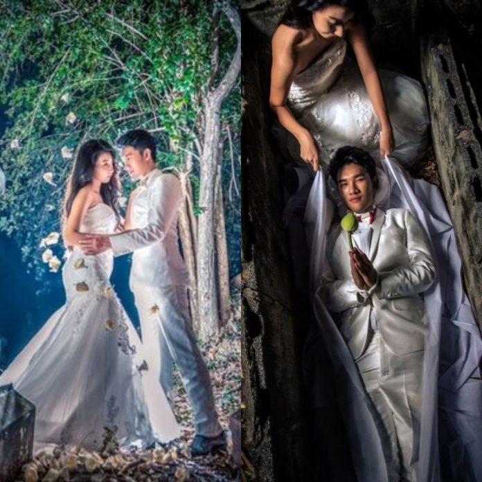 A young couple has gone viral after they posed inside a coffin for a funeral-themed pre-wedding shoot.