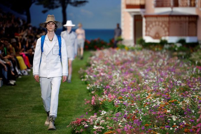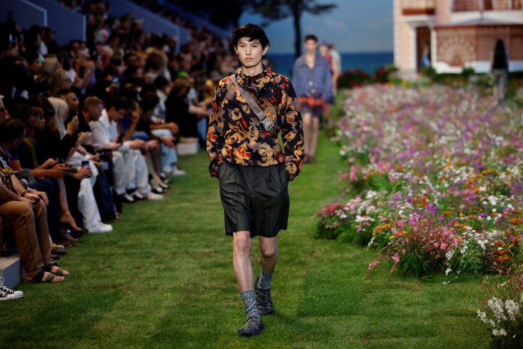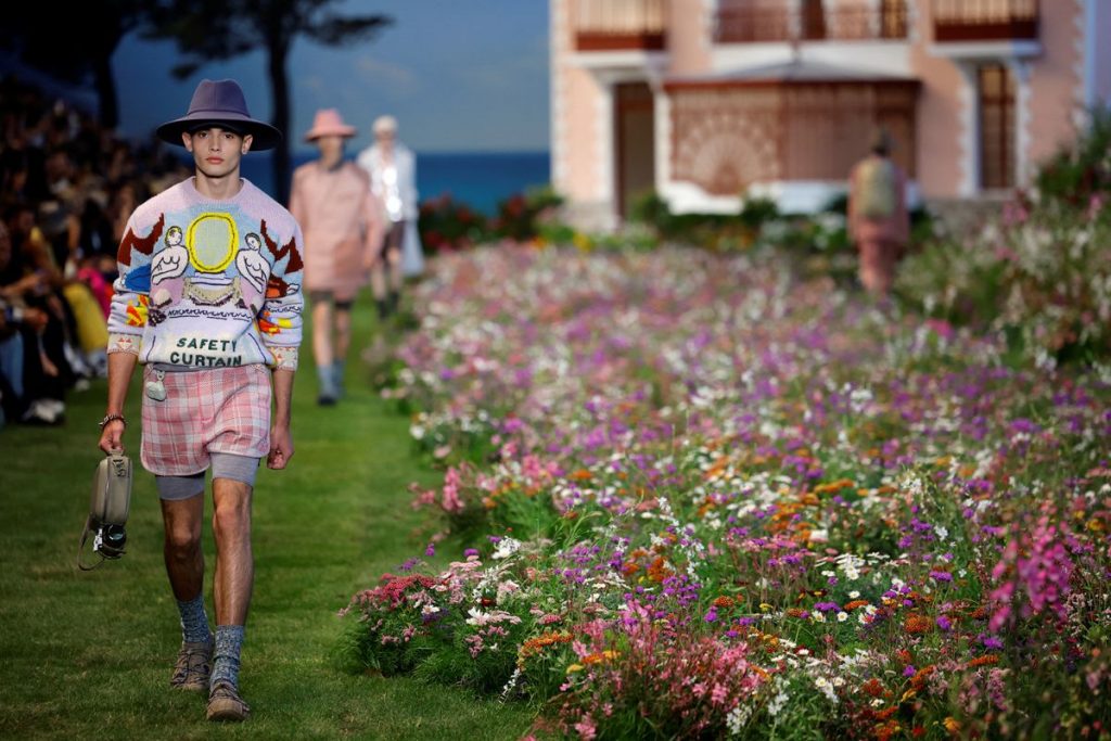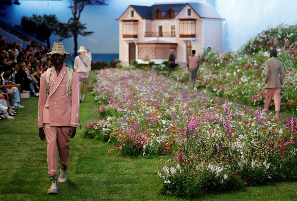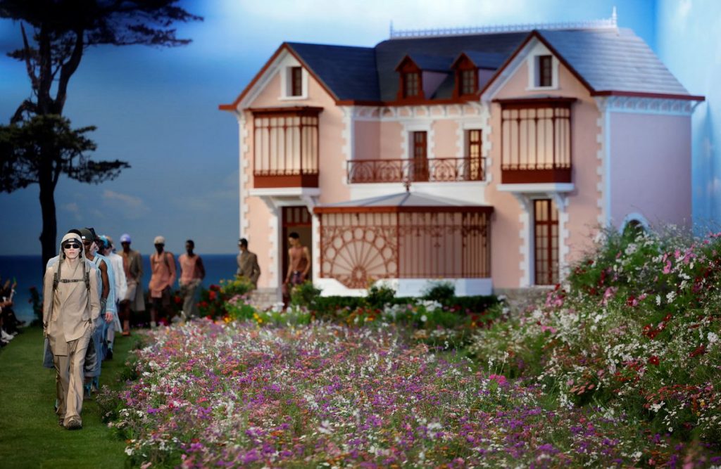 Dior menswear artistic director Kim Jones set up the runway in a makeshift space in central Paris for the show during Men’s Fashion Week. The catwalk was transformed into a lawn of purple, orange, and pink flowers, with a blue-sky painted panorama and a life-size reproduction of Christian Dior’s pink house in Normandy.