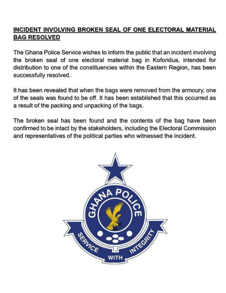 The Ghana Police Service has resolved an incident involving a broken seal on an electoral material bag in Koforidua, meant for a constituency in the Eastern Region.