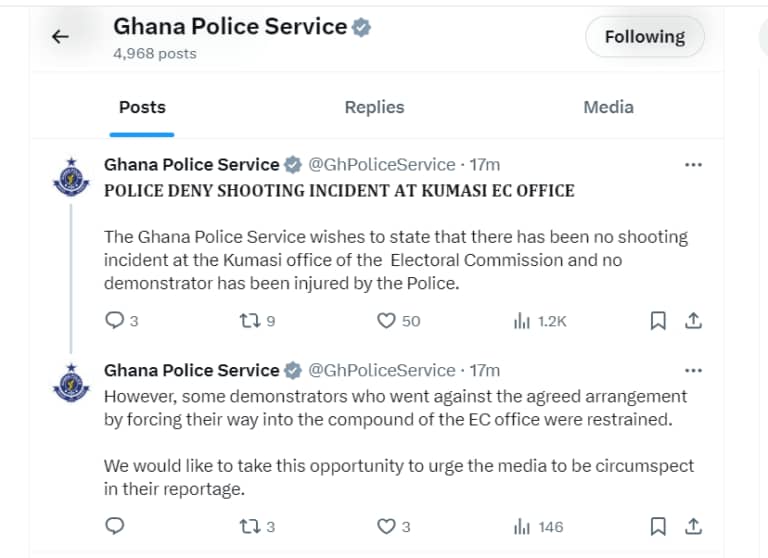 The police have stated that there was no shooting incident at the Kumasi office of the Electoral Commission, and no demonstrator was injured by officers.