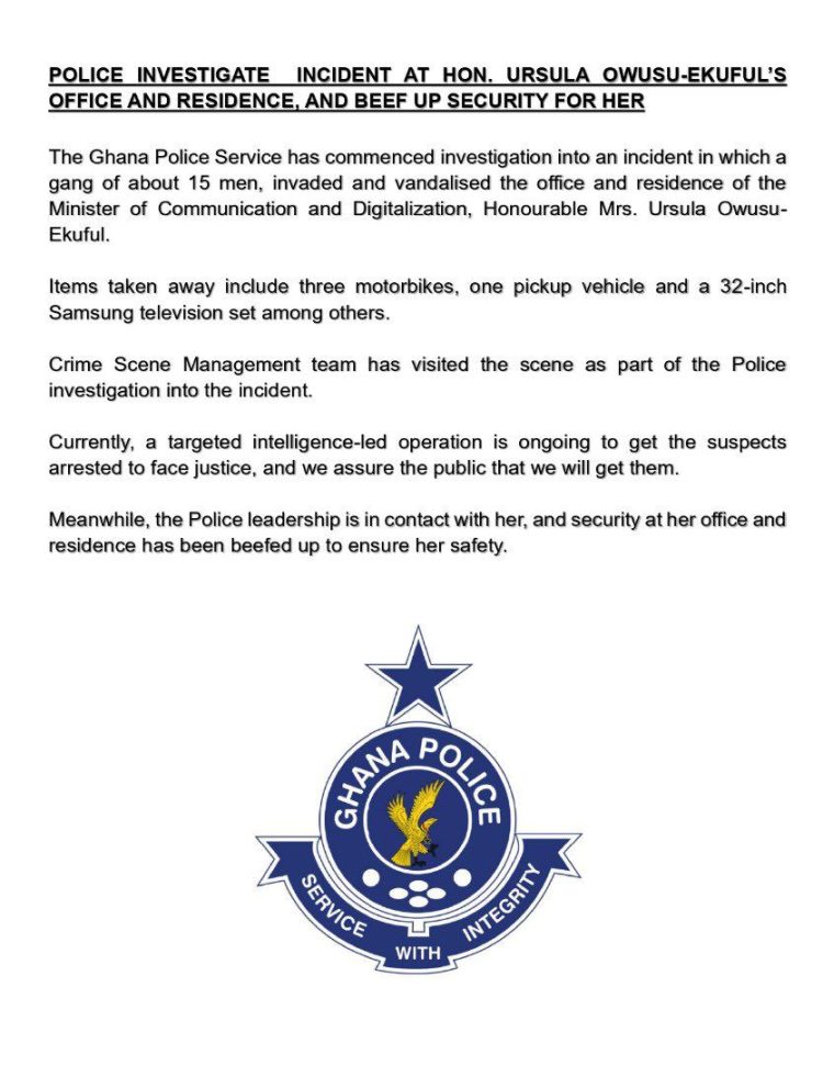 The Ghana Police Service has launched an investigation into a violent attack on the office and residence of Ursula Owusu-Ekuful, the outgoing Minister for Communication and Digitalization. Reports indicate that a gang of about 15 men allegedly invaded the premises, causing extensive damage and stealing several items.