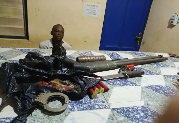 On his arrest, the Police retrieved a pump-action gun, a jackknife, one handcuff, seven AAA live cartridges, one empty AAA cartridge and a talisman concealed in a bag he was holding.