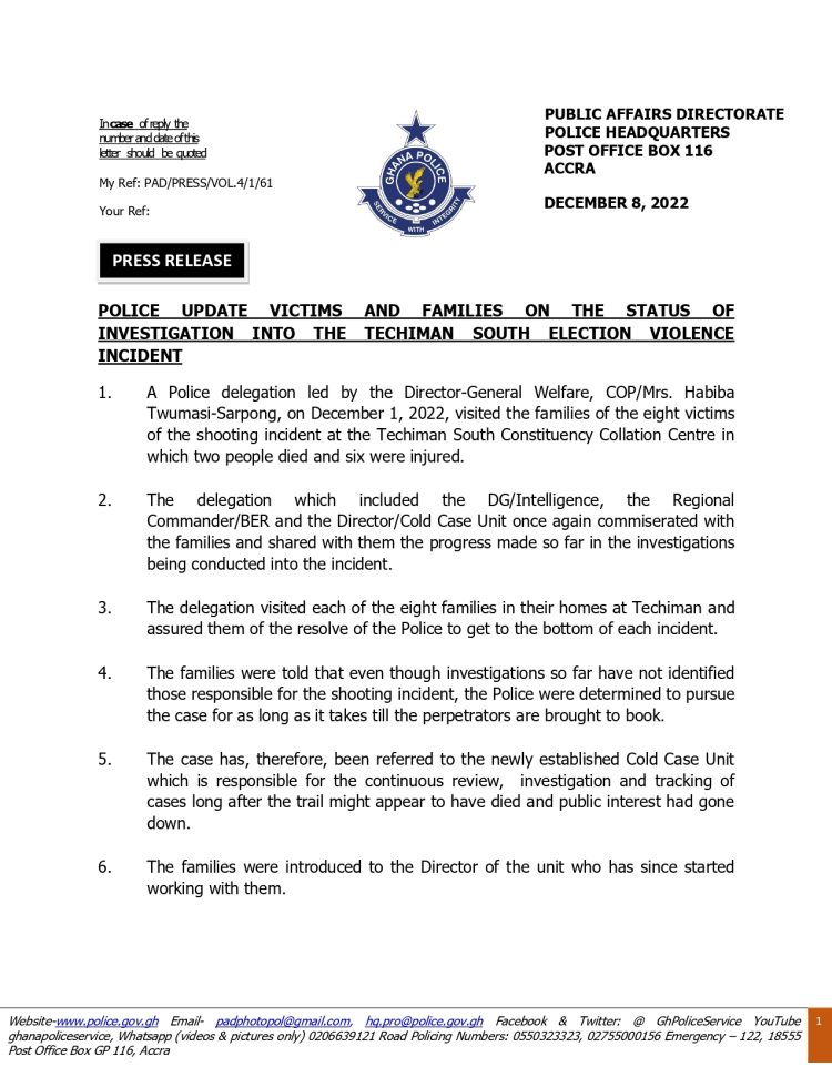 A police delegation led by the Director-General of Welfare, COP/Mrs. Habiba Twumasi-Sarpong has also visited the families of the eight victims of the shooting incident.