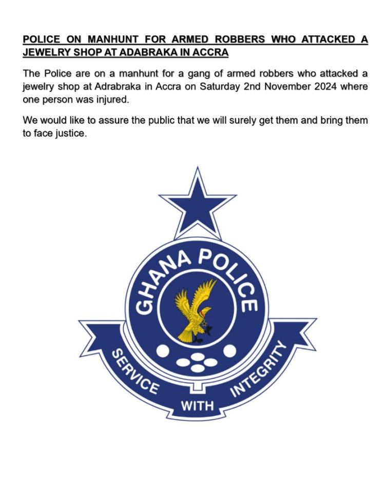 The police are currently conducting a manhunt for armed robbers who attacked a jewellery shop in Adabraka on Saturday, November 2, 2024, leaving one person injured.
