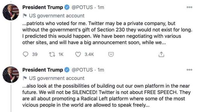 After Twitter had permanently suspended his @realDonaldTrump account, Mr Trump tweeted from the US president’s official @Potus account suggesting he would “look at the possibilities of building out our own platform in the future” and railing against Twitter.