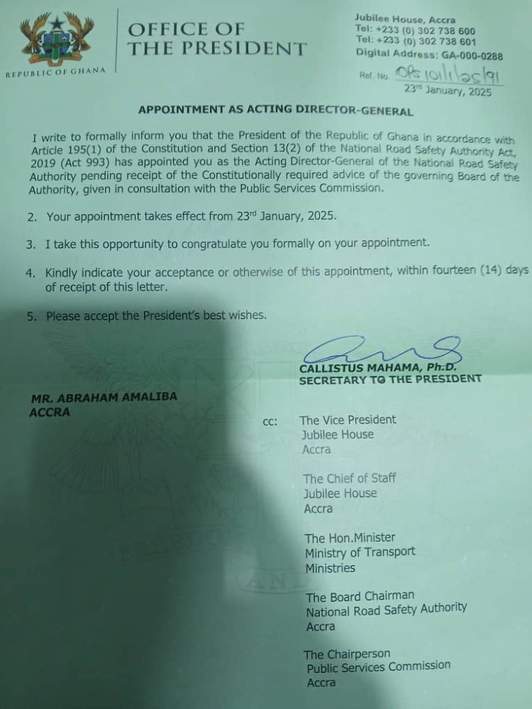 President John Dramani Mahama has appointed Abraham Amaliba as the Acting Director-General of the National Road Safety Authority, effective January 23, 2025.