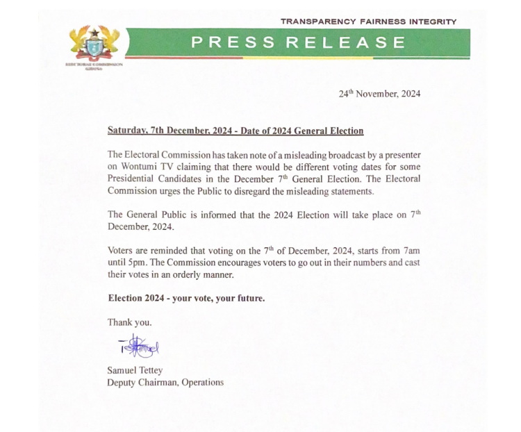 The EC, therefore, in a statement issued on Sunday, November 24, noted that “The Electoral Commission urges the public to disregard the misleading statements.”