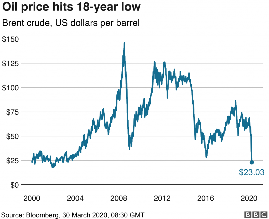 The price of oil has sunk to levels not seen since 2002 as demand for crude collapses amid the coronavirus pandemic.