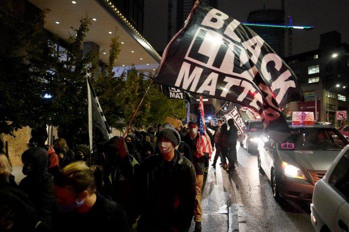 More than 1,000 people protesting President Donald Trump descended on Black Lives Matter Plaza on Tuesday night, just a block from the White House while hundreds more marched through parts of downtown Washington sometimes blocking traffic and setting off fireworks.
