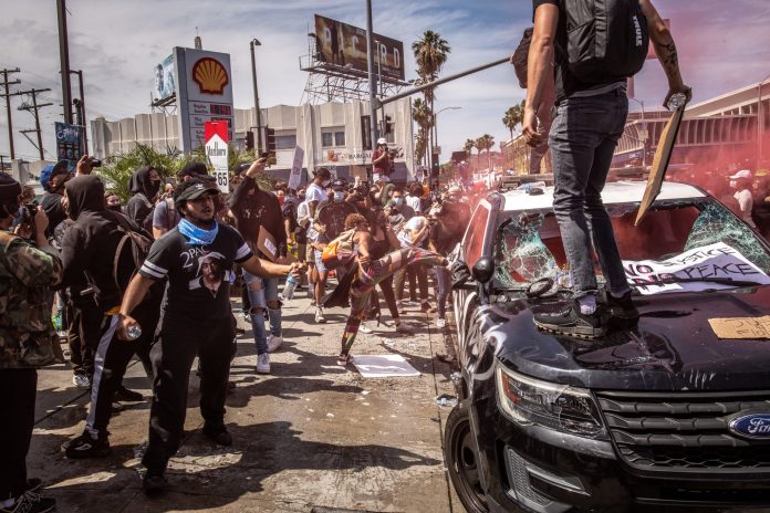 Tens of thousands of people were in the streets across the United States on Saturday night, as demonstrations stretched from coast to coast in a national paroxysm of rage that saw buildings set on fire, businesses looted and an aggressive response from the authorities.