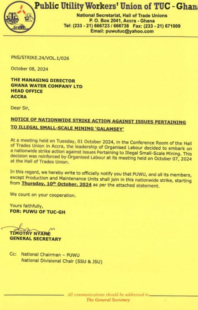 In a letter sent to the Managing Director of the Ghana Water Company on Tuesday, October 8, PUWU stated that all its members, except those in the Production and Maintenance Units, would be joining the strike.
