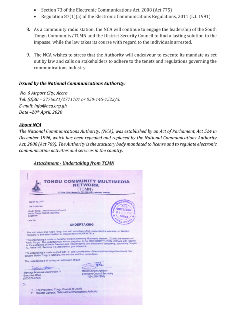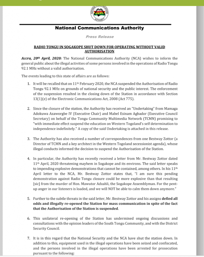 The National Communications Authority (NCA) ordered Radio Tongu to shut operations with immediate effect over national Security and public interest concerns.
