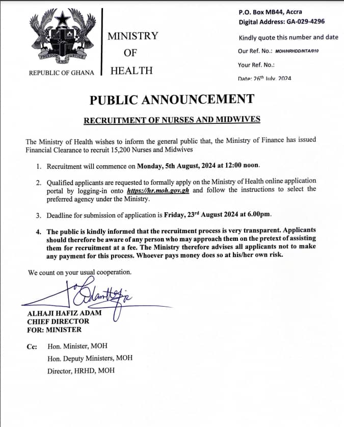 The Ministry of Health has announced that the recruitment of 15,200 nurses and midwives will start on Monday, August 5, 2024, at 12:00 noon. This follows Financial Clearance from the Ministry of Finance.