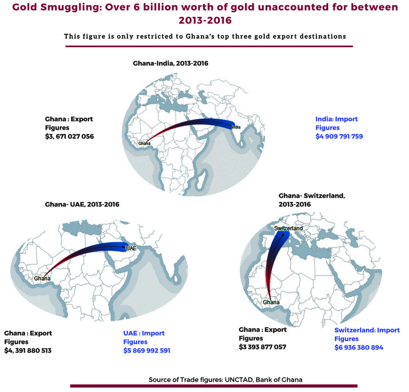 In an assessment of the trade data between Ghana and its three major gold trading partners—Switzerland, India and the United Arab Emirates— it revealed that over $6 billion worth of gold exports remains unaccounted for from 2013 to 2016.