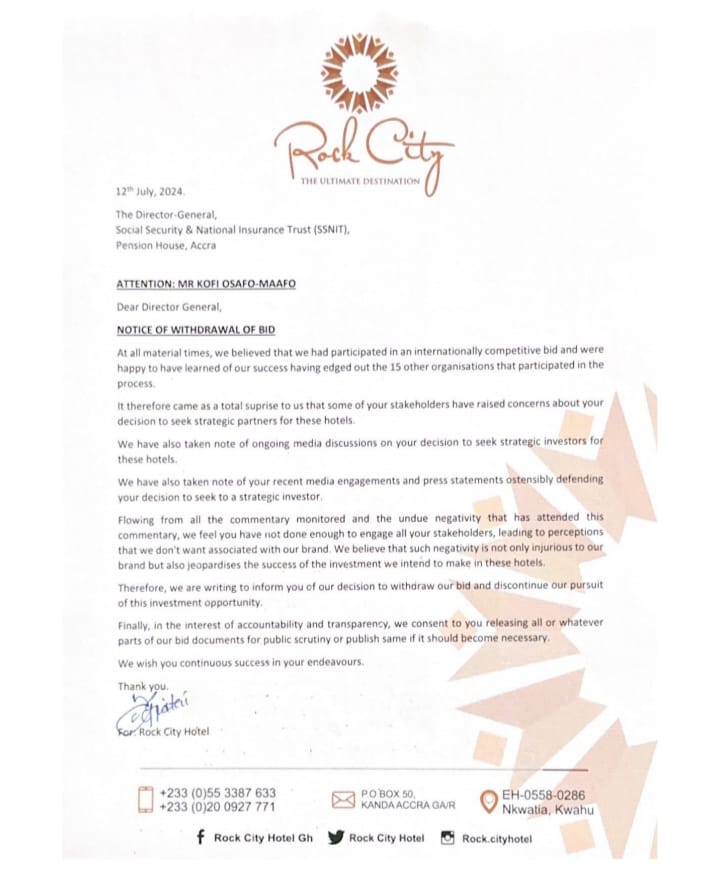 In a letter addressed to SSNIT’s Director-General, Mr. Kofi Osafo-Maafo, Rock City Hotel expressed disappointment at the lack of stakeholder engagement, which it feels has contributed to the negative sentiment surrounding the bid. Consequently, Rock City Hotel has chosen to halt its pursuit of this investment opportunity.