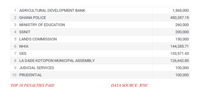 It is followed by the Ghana Police Service, which has paid GHS450,357.15, and the Ministry of Education, which paid GHS260,000 for repeated non-compliance.