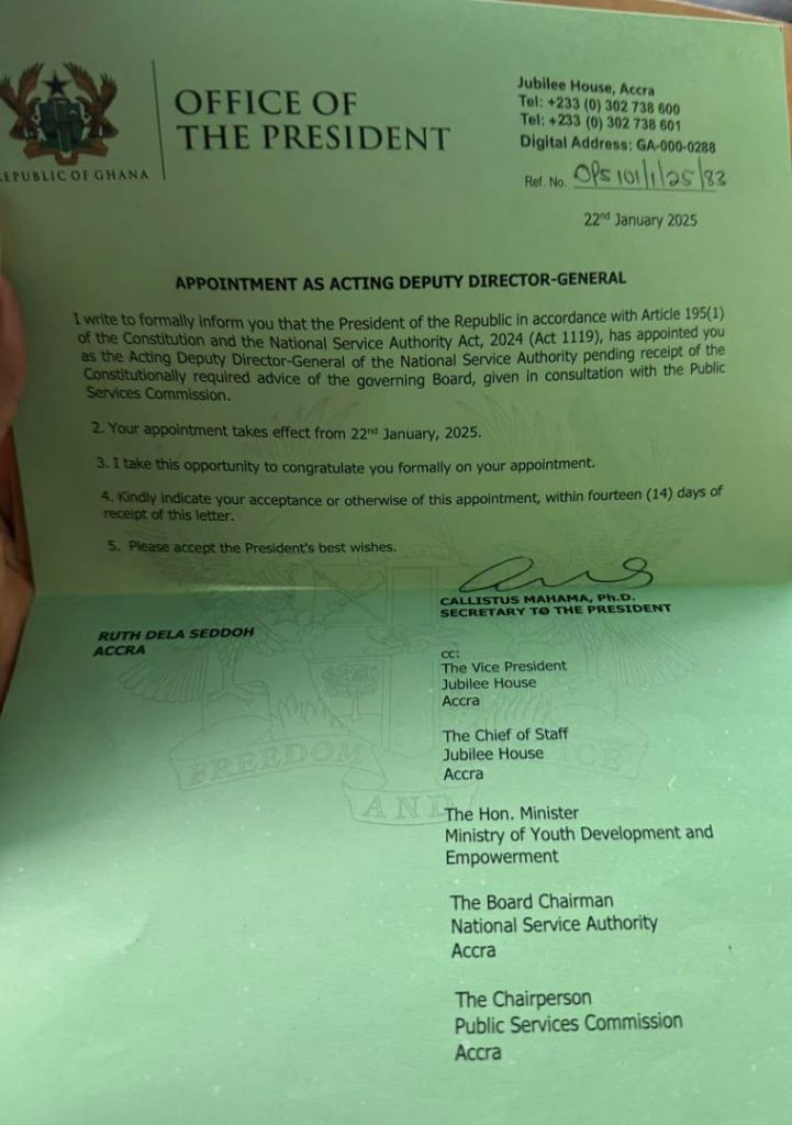 President John Dramani Mahama has appointed Ruth Dela Seddoh as the Acting Deputy Director-General of the National Service Authority (NSA), pending the constitutionally required advice from the NSA Governing Board, in consultation with the Public Services Commission.