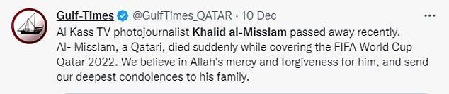 Qatar news outlet Gulf Times tweeted: ‘Al-Misslam, a Qatari, died suddenly while covering the FIFA World Cup Qatar 2022.