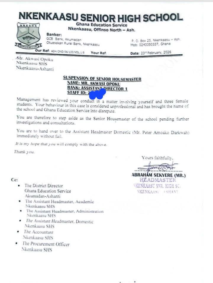 The Senior Housemaster of Nkenkaasu Senior High School, Akwasi Opoku, has been suspended by the management of the school following allegations of misconduct involving three female students.