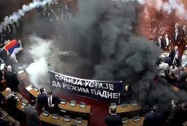 Serbian opposition lawmakers threw smoke grenades and tear gas inside parliament on Tuesday to protest against the government and support demonstrating students, with one legislator suffering a stroke during the chaos.