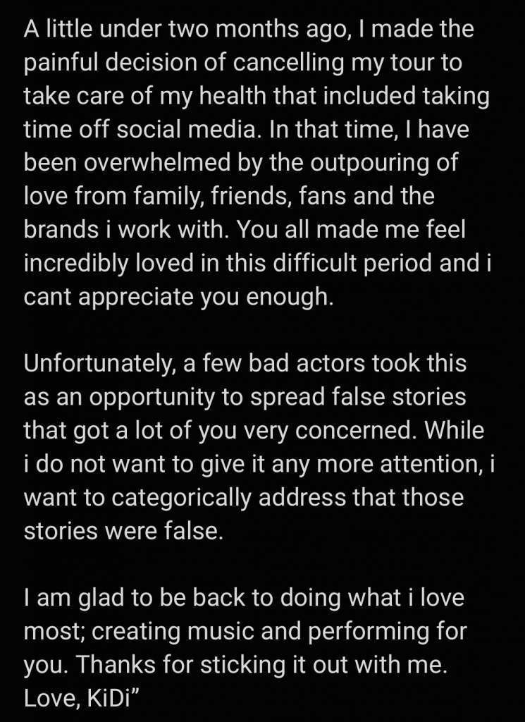 “I am glad to be back to doing what I love most; creating music and performing for you. Thanks for sticking it out with me. Love. Kidi”