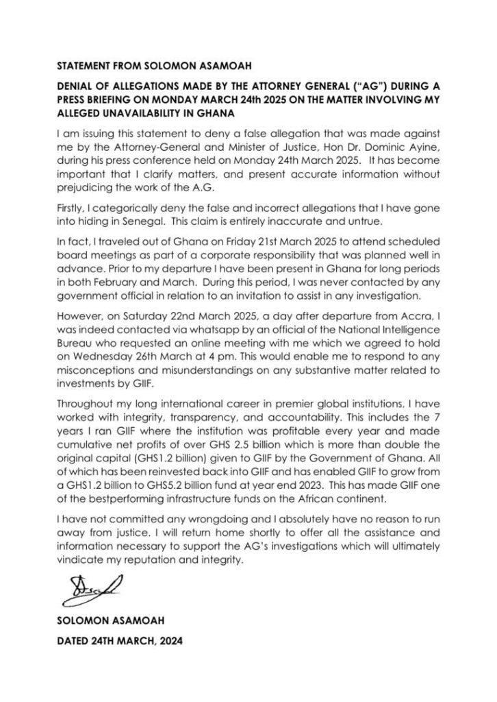 Former CEO of the Ghana Infrastructure Investment Fund (GIIF), Solomon Asamoah, has dismissed allegations by Attorney General Dr. Dominic Ayine that he fled to Senegal to evade justice.