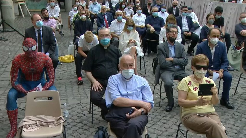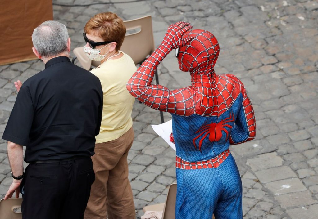 A man dressed in a full, skin-tight, red, black and blue costume of the comic book and film character – including head cover – sat in the VIP section of the audience in Vatican’s San Damaso Courtyard.