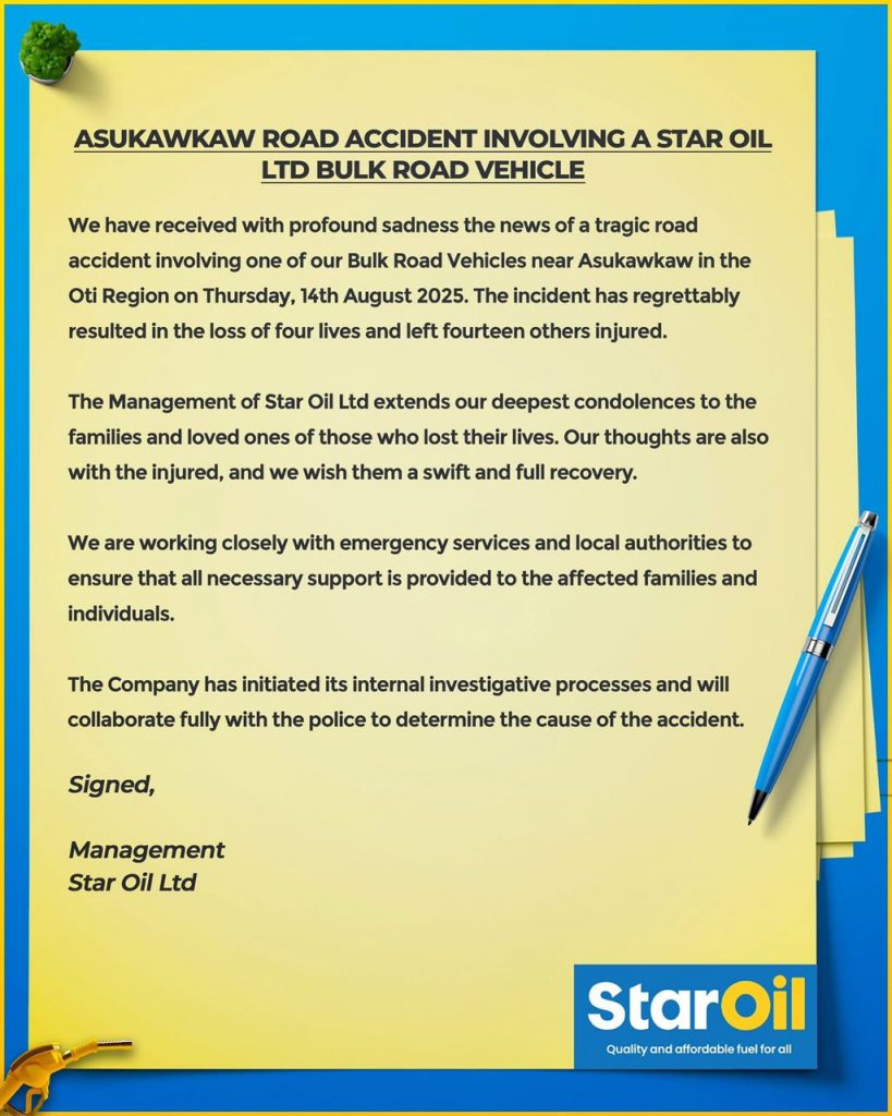 Star Oil Ltd has begun a comprehensive investigation into a tragic road accident involving one of its Bulk Road Vehicles (BRVs) near Asukawkaw in the Oti Region on Thursday, August 14, 2025.