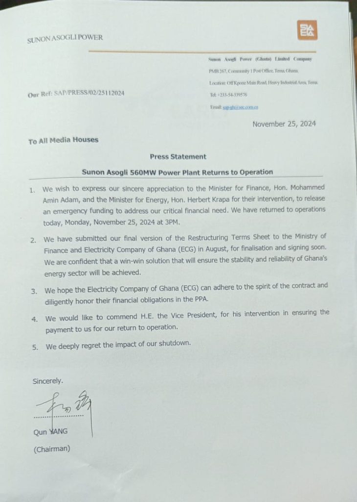 The power plant had been shut down since October 2024, with Sunon Asogli reporting a net receivable of $259 million (excluding fuel) owed by ECG as of September 2024.