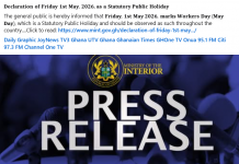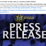 he Ministry of the Interior has declared Friday, May 1, 2026, a statutory public holiday to mark May Day, also known as...