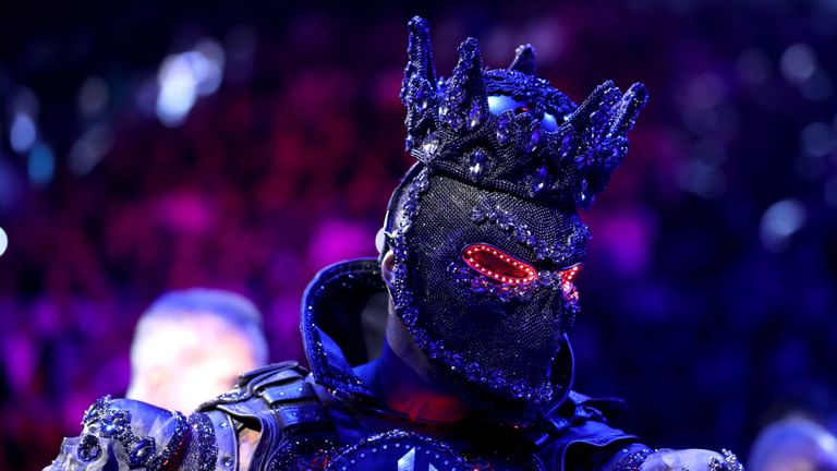 Wilder followed a few minutes later, his face hidden behind a glittery mask and a rapper in front of him.