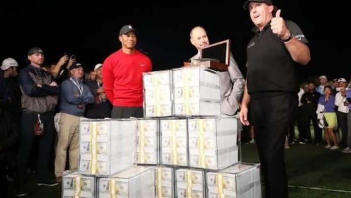 Mickelson beat Woods to claim the $9m prize when they met in a matchplay duel in Las Vegas in 2018.