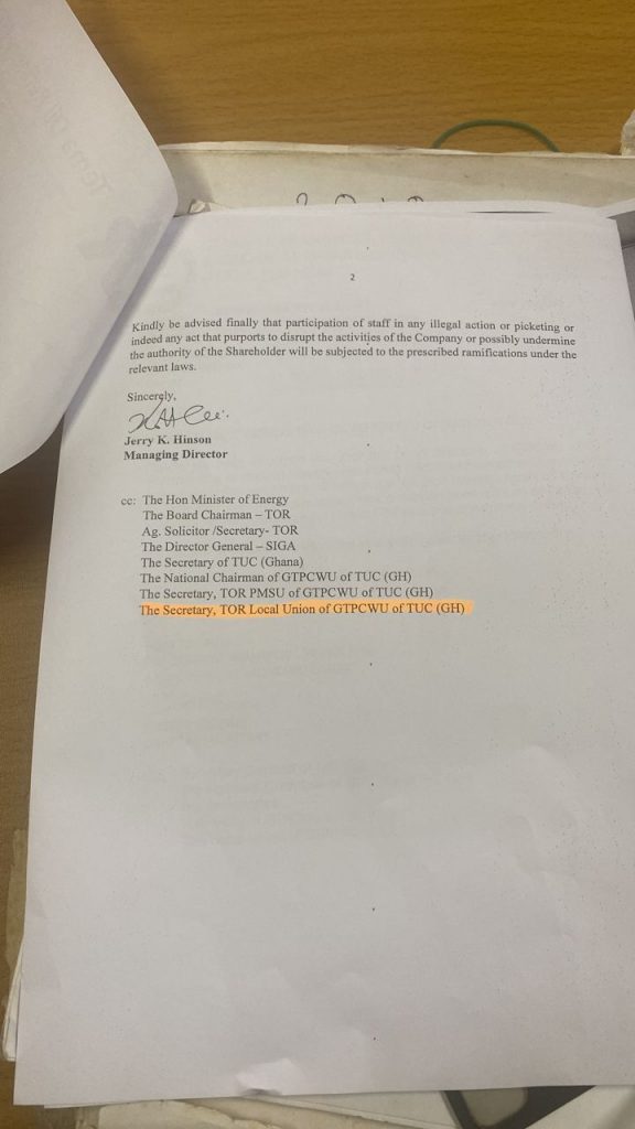“Kindly be advised finally that participation of staff in any illegal action or picketing or indeed any act that purports to disrupt the activities of the Company or possibly undermine the authority of the Shareholder will be subjected to the prescribed ramifications under the relevant laws.”