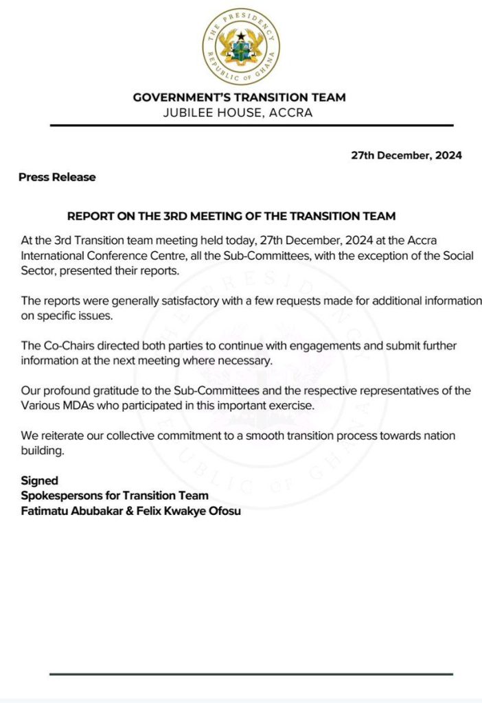 The Transition Team, responsible for overseeing the transfer of government operations, convened on Friday, December 27, 2024, at the Accra International Conference Centre to receive reports from its various subcommittees.