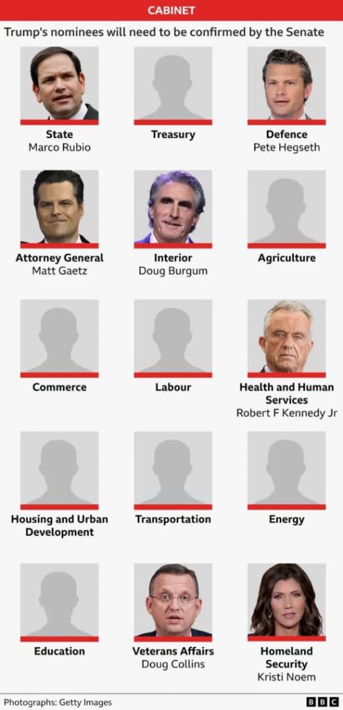 Other key positions, including FBI director and Treasury Secretary, remain unfilled, with the president-elect continuing to assemble his team ahead of his inauguration.