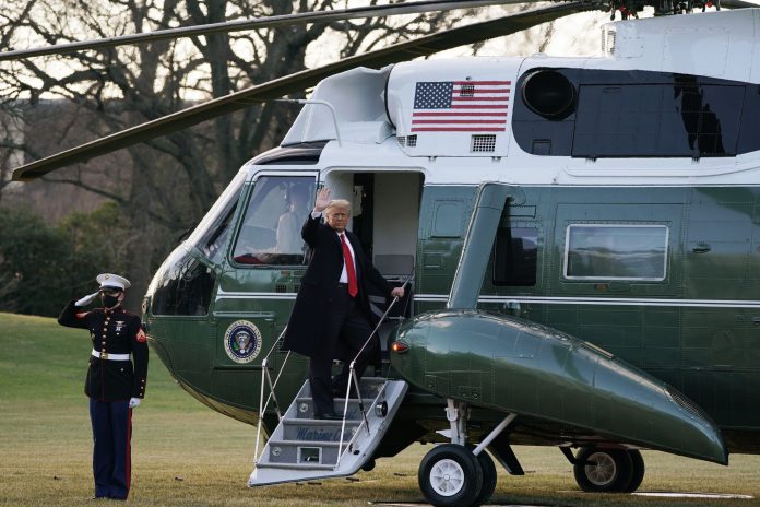 The Marine One helicopter took off from the South Lawn of the White House at about 8:18 a.m. for the short flight to Joint Base Andrews in suburban Maryland, where the president planned to hold a farewell event with administration veterans and other supporters. After that, he and Mrs. Trump were to board Air Force One for the journey to Florida, where they will reside.