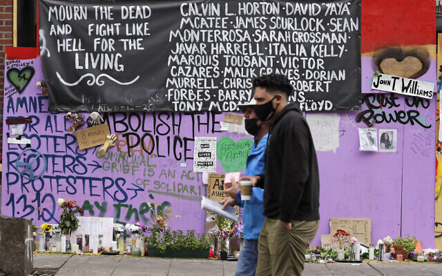Two people walk past a memorial Sunday, June 28, 2020, in Seattle, for people of color believed to have died in police custody, where several streets are blocked off in what has been named the Capitol Hill Occupied Protest zone.