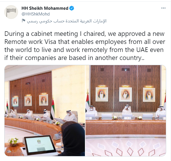 His post reads: “During a cabinet meeting I chaired, we approved a new Remote work Visa that enables employees from all over the world to live and work remotely from the UAE even if their companies are based in another country.”