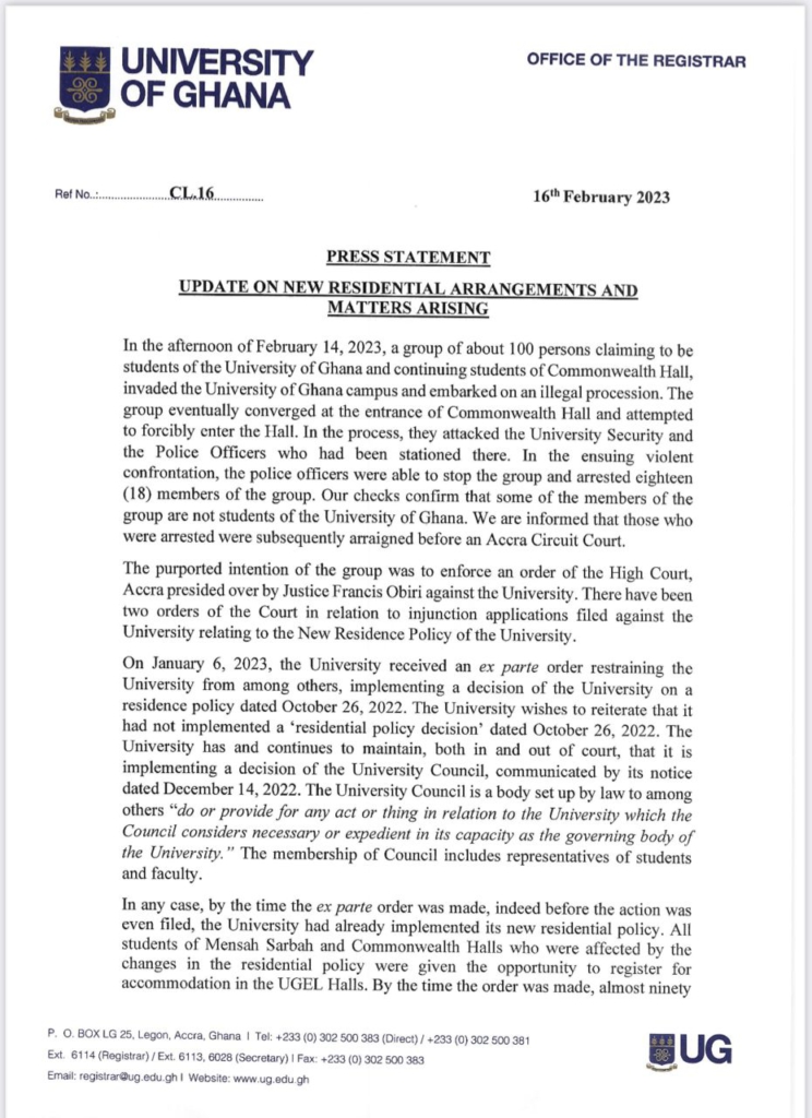 In the statement dated February 16, the Registrar, Emelia Agyei-Mensah, explained that “in spite of the difficulty in comprehending the ex parte order, as it related to a decision that did not exist, upon receipt of the order, the University immediately stopped further allocation of rooms at Commonwealth Hall out of the abundance of caution.”