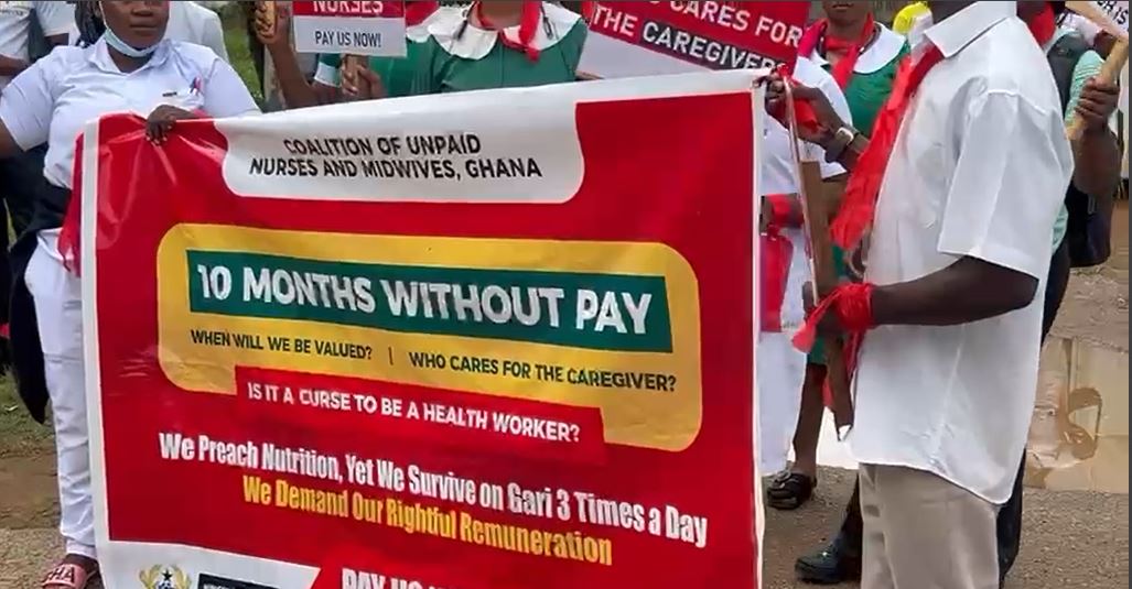 The Coalition of Unpaid Nurses and Midwives in Ghana is demanding that the government immediately settle all outstanding salary arrears, describing the recent payment of one month’s salary as an insult.