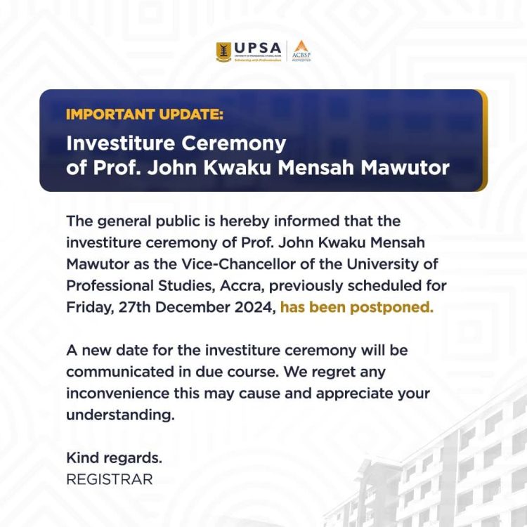 The University of Professional Studies, Accra (UPSA) has announced the postponement of the investiture ceremony for its incoming Vice-Chancellor, Professor John Kwaku Mensah Mawutor.