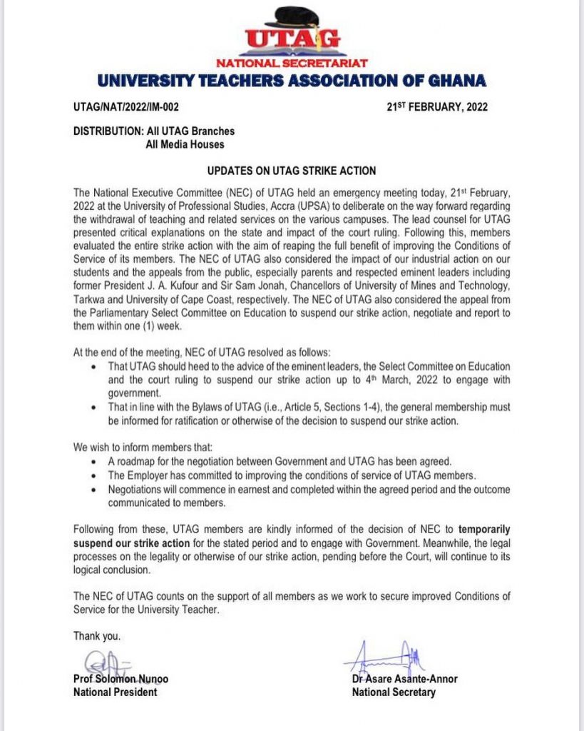 The announcement was made via a Facebook post by General Secretary of the University of Ghana Branch of UTAG, Professor Ransford Gyampo, who said the decision to suspend the strike was reached by the UTAG National Executive Committee meeting held on Monday, February 21, 2022.