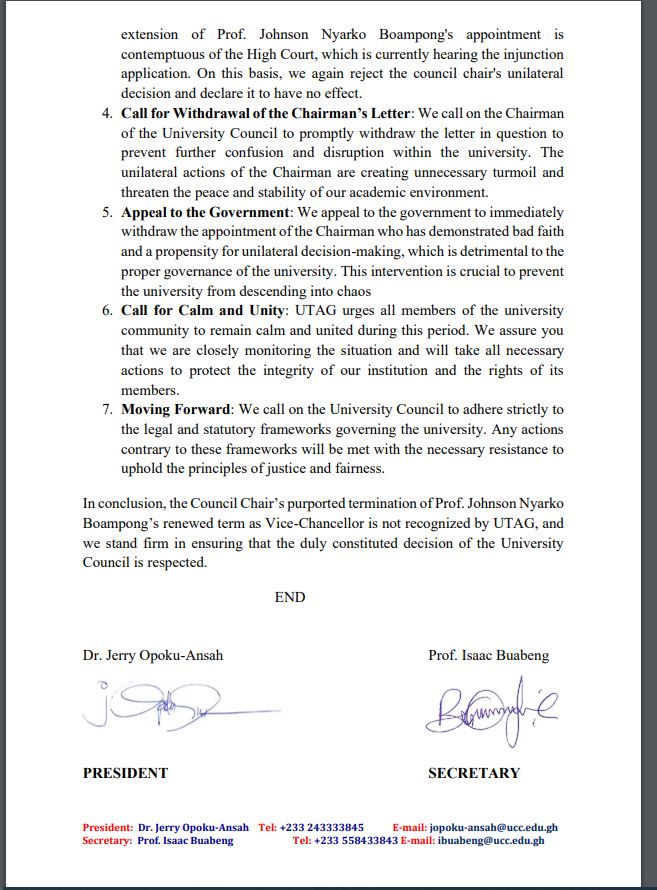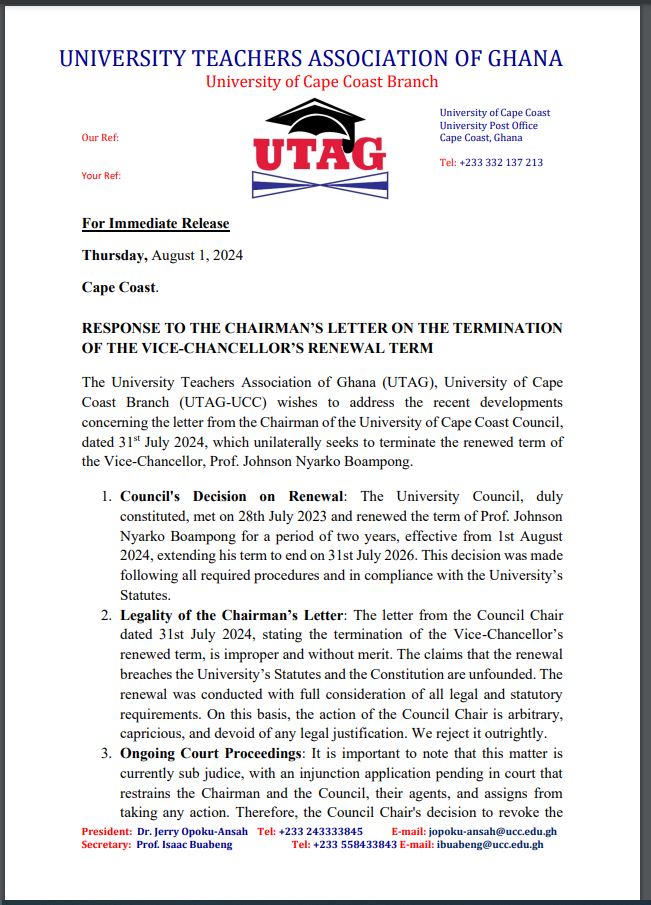 The University of Cape Coast branch of the University Teachers Association of Ghana (UTAG-UCC) does not recognize the unilateral decision by the University’s Council Chair to terminate Prof. Johnson Nyarko Boampong’s appointment as Vice-Chancellor.