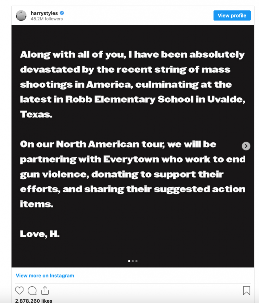 “Along with all of you, I have been absolutely devastated by the recent string of mass shootings in America, culminating at Robb Elementary School in Texas,” Styles wrote on Instagram. “On our North American tour, we will be partnering with Everytown who work to end gun violence, donating to support their efforts, and sharing their suggested action items.”