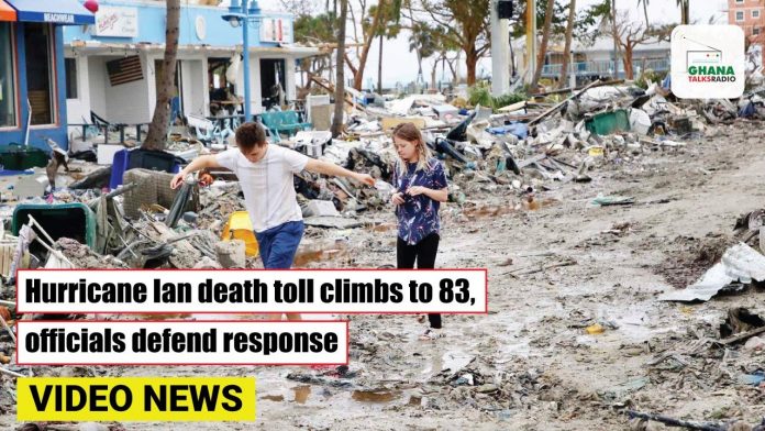 The death toll from Hurricane Ian climbed past 80 on Sunday as embattled residents in Florida and the Carolinas faced a recovery expected to cost tens of billions of dollars, and some officials faced criticism over their response to the storm.