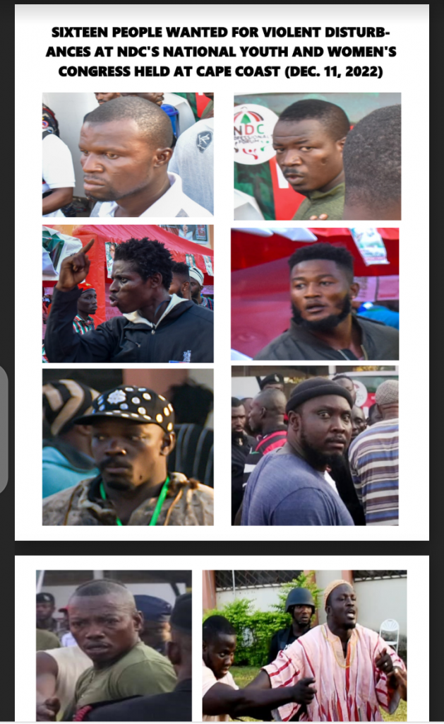 Police on Sunday evening (December 11) declared 16 men wanted for their roles in clashes at the just-ended Youth and Women’s Organizer Conference of the National Democratic Congress (NDC).